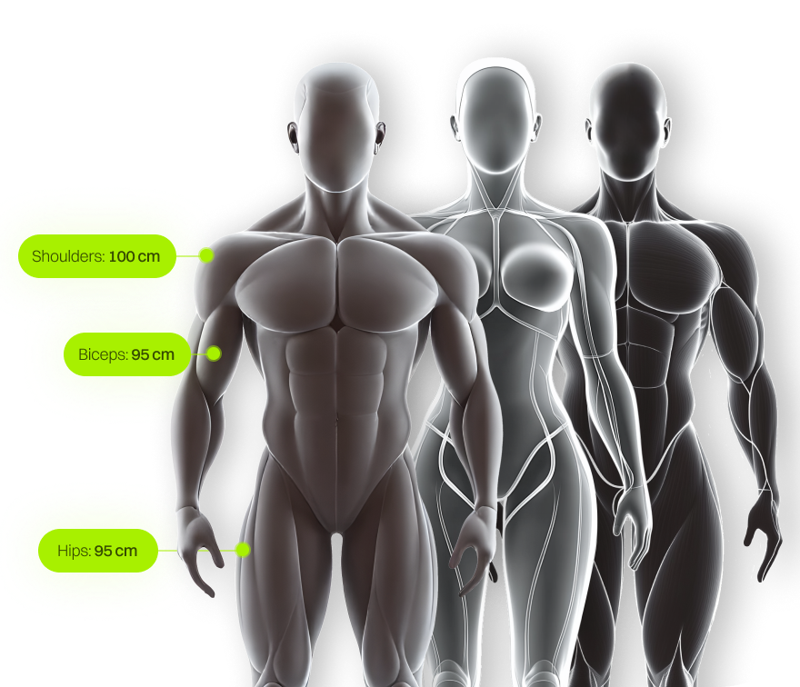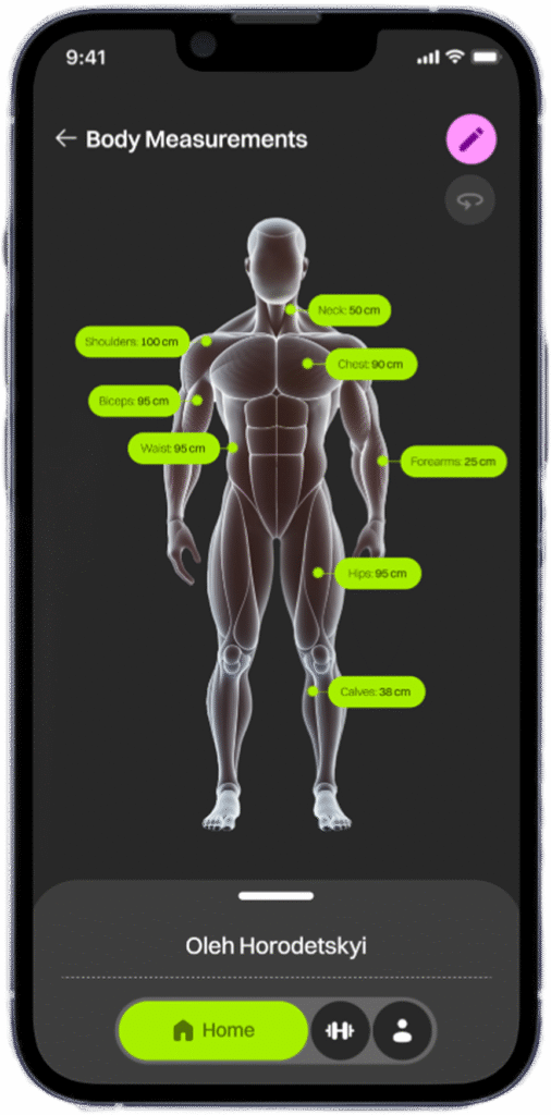 Record your body measurements on a human figure, and start tailored workouts for your chosen goal.