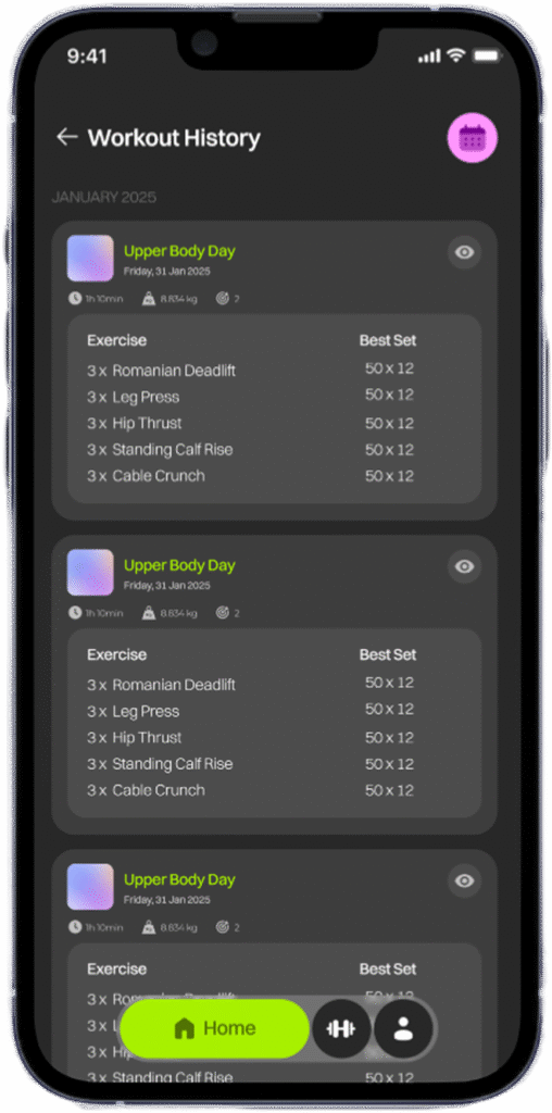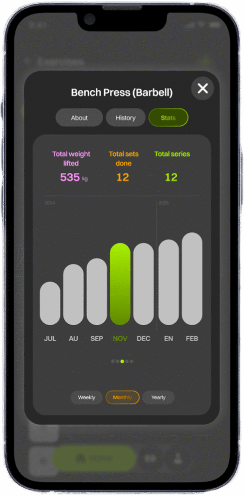Save all your workouts in a detailed history and view your progress through weekly, monthly, and yearly graphs based on your training results.
